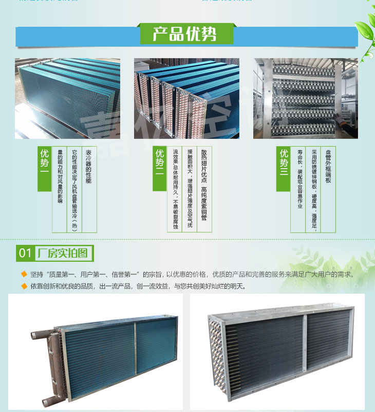 TL型高效換熱系銅管穿鋁片式換熱器,它 采用了先進(jìn)的機(jī)械漲管和圓弧波紋雙翻邊鋁肋 片結(jié)構(gòu)型式。機(jī)械漲管使銅管與鋁肋片接觸緊 密,圓弧波紋能促進(jìn)流體率流,破壞邊界層,提出傳熱系數(shù)。先進(jìn)的結(jié)構(gòu)型式、再加上水路 行程,管距,片距設(shè)計合理,使得該換熱器具 有傳熱性能好,空氣阻力小,結(jié)構(gòu)緊湊,重量 輕等特點(diǎn)。它可廣泛應(yīng)用于空調(diào),冷卻、去濕、采暖等工程中,是新風(fēng)機(jī)組和空氣處理機(jī)組理想的配套產(chǎn)品,它又可與風(fēng)管連接作為冷若冰霜卻或加熱單獨(dú)使用。銅管焊接采用低溫快速釬焊,確保耐壓>1.2Mpa。